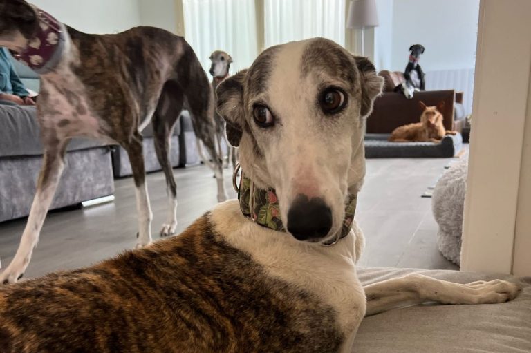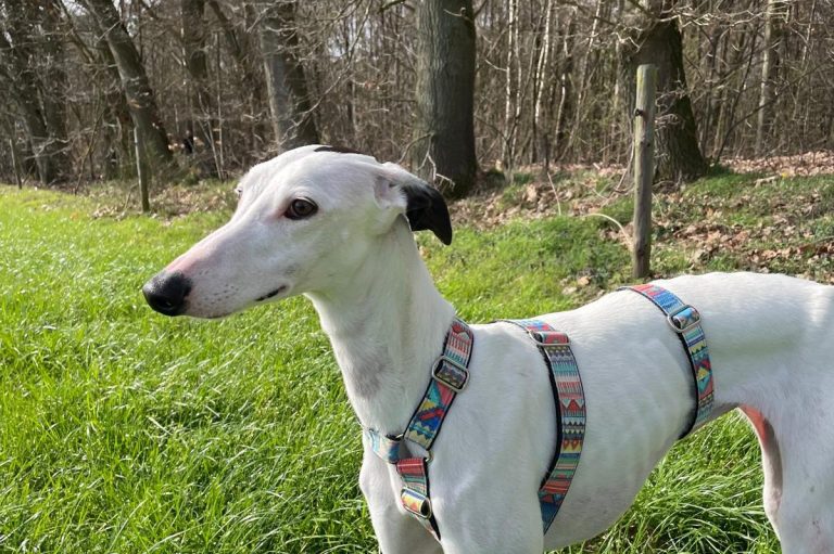 Oli is net binnen en is een galga van ongeveer 4 à 5 jaar oud. Ze is niet extreem angstig, maar nog wel wat onzeker. Klik op de foto voor meer info.
